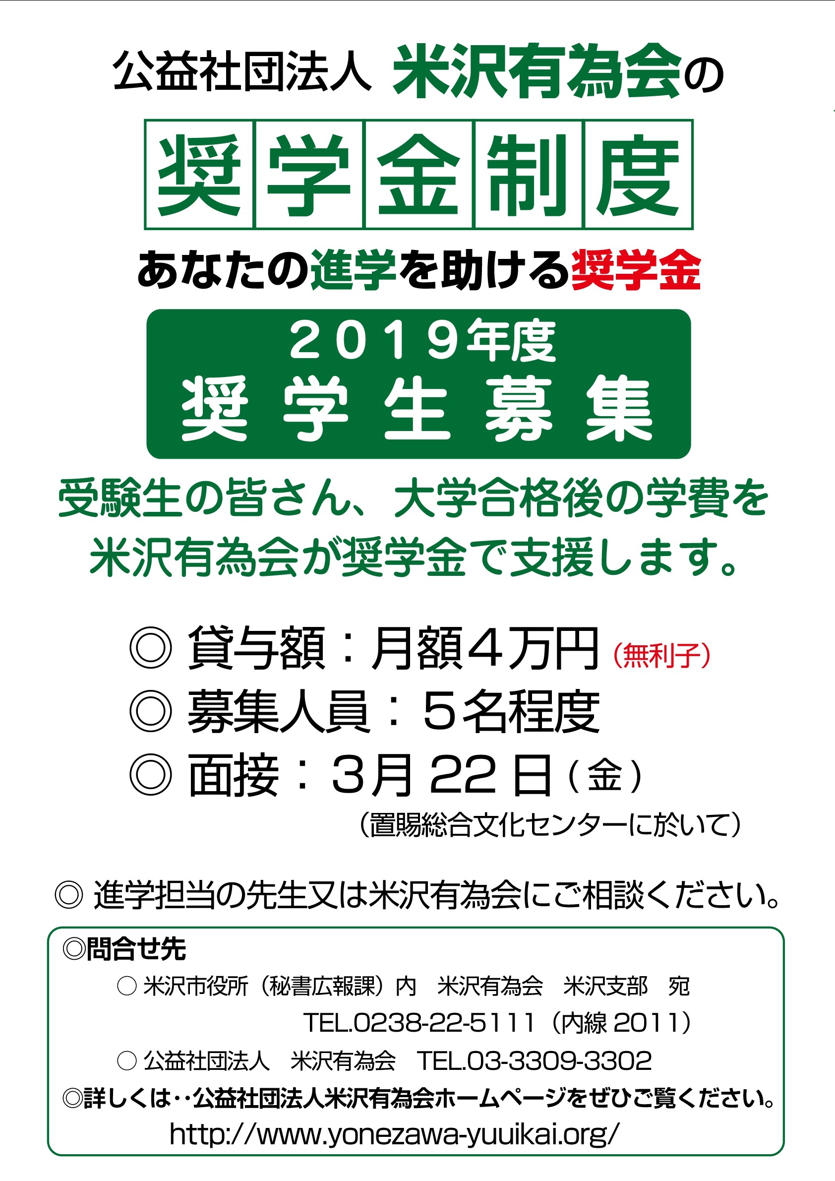 なお米沢有為会の奨学金制度は、米沢市の奨学金返還支援事業の対象になっています。 大学卒業後山形県内に居住かつ就業する新規応募者および既貸与者が対象です。