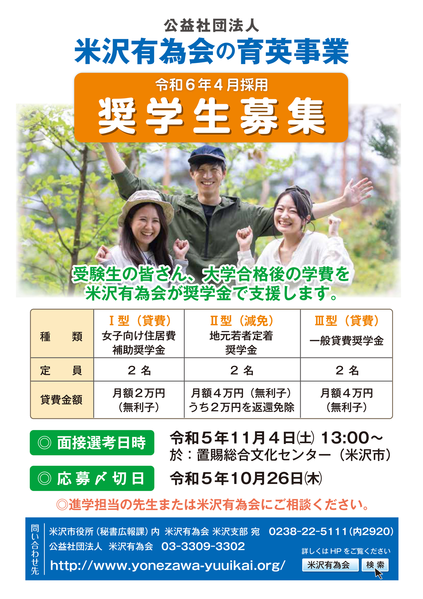 なお米沢有為会の奨学金制度は、米沢市の奨学金返還支援事業の対象になっています。 大学卒業後山形県内に居住かつ就業する新規応募者および既貸与者が対象です。