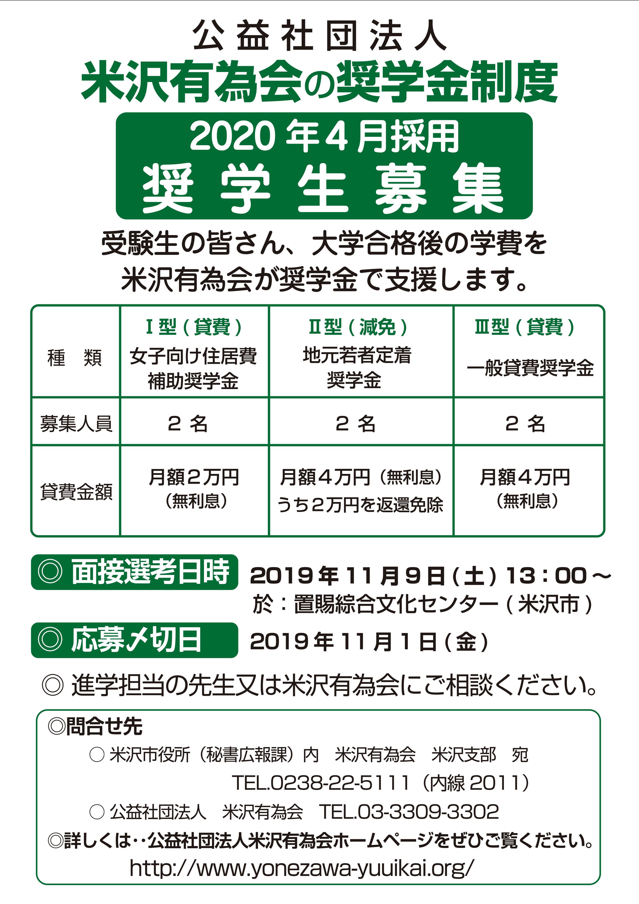 なお米沢有為会の奨学金制度は、米沢市の奨学金返還支援事業の対象になっています。 大学卒業後山形県内に居住かつ就業する新規応募者および既貸与者が対象です。