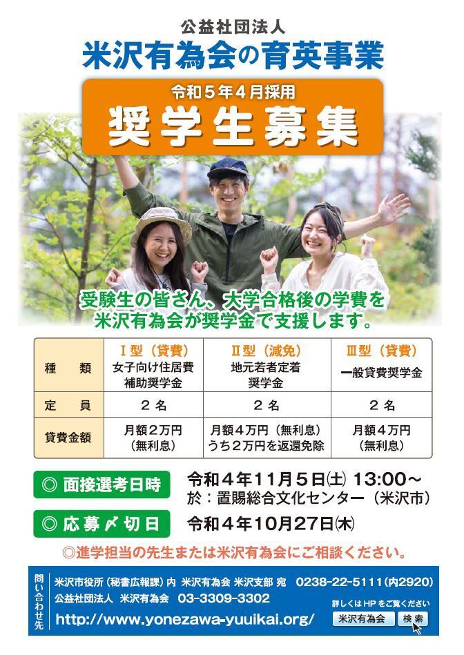 なお米沢有為会の奨学金制度は、米沢市の奨学金返還支援事業の対象になっています。 大学卒業後山形県内に居住かつ就業する新規応募者および既貸与者が対象です。