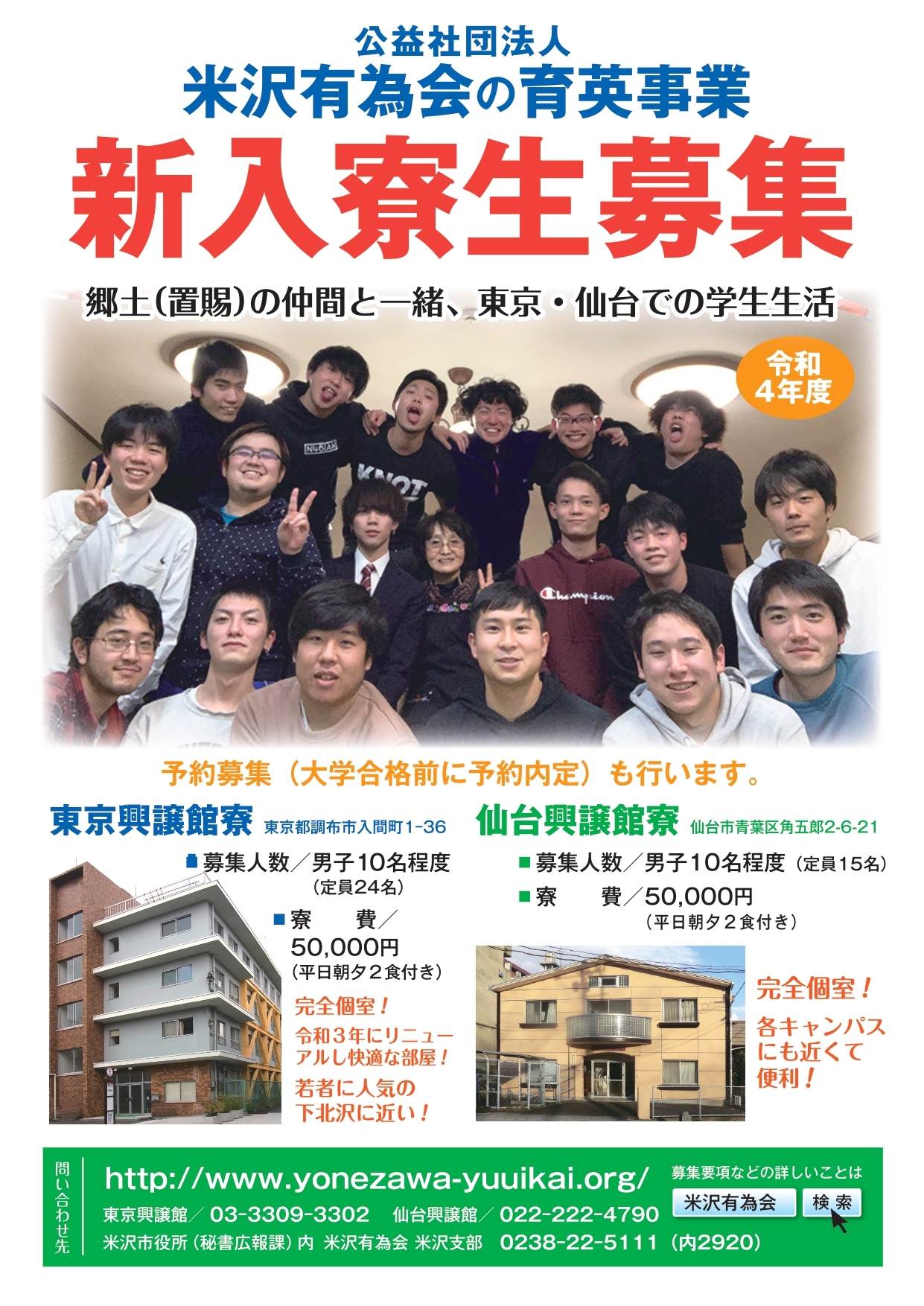 米沢有為会の運営する学生寮は東京興譲館寮と仙台興譲館寮の2つで、多くの置賜地方の高校出身者などが利用しています。