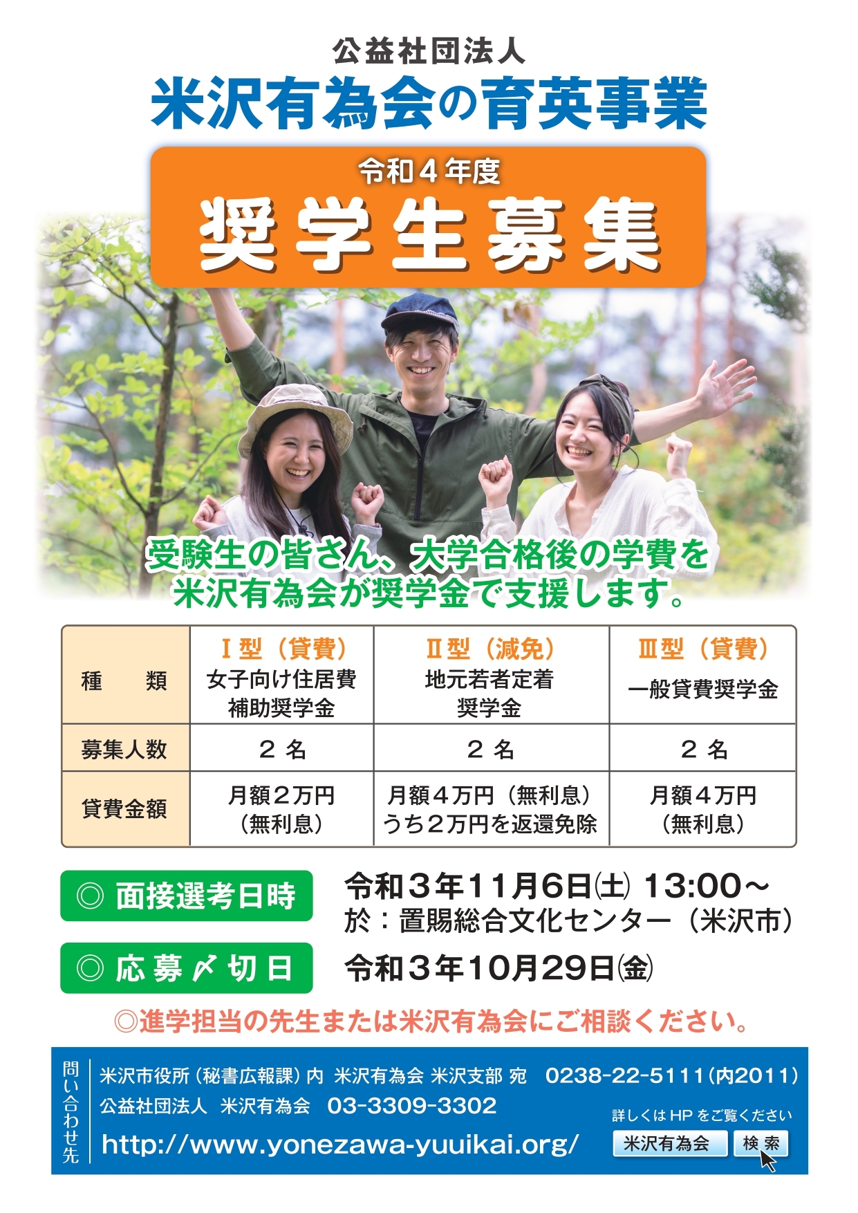 なお米沢有為会の奨学金制度は、米沢市の奨学金返還支援事業の対象になっています。 大学卒業後山形県内に居住かつ就業する新規応募者および既貸与者が対象です。