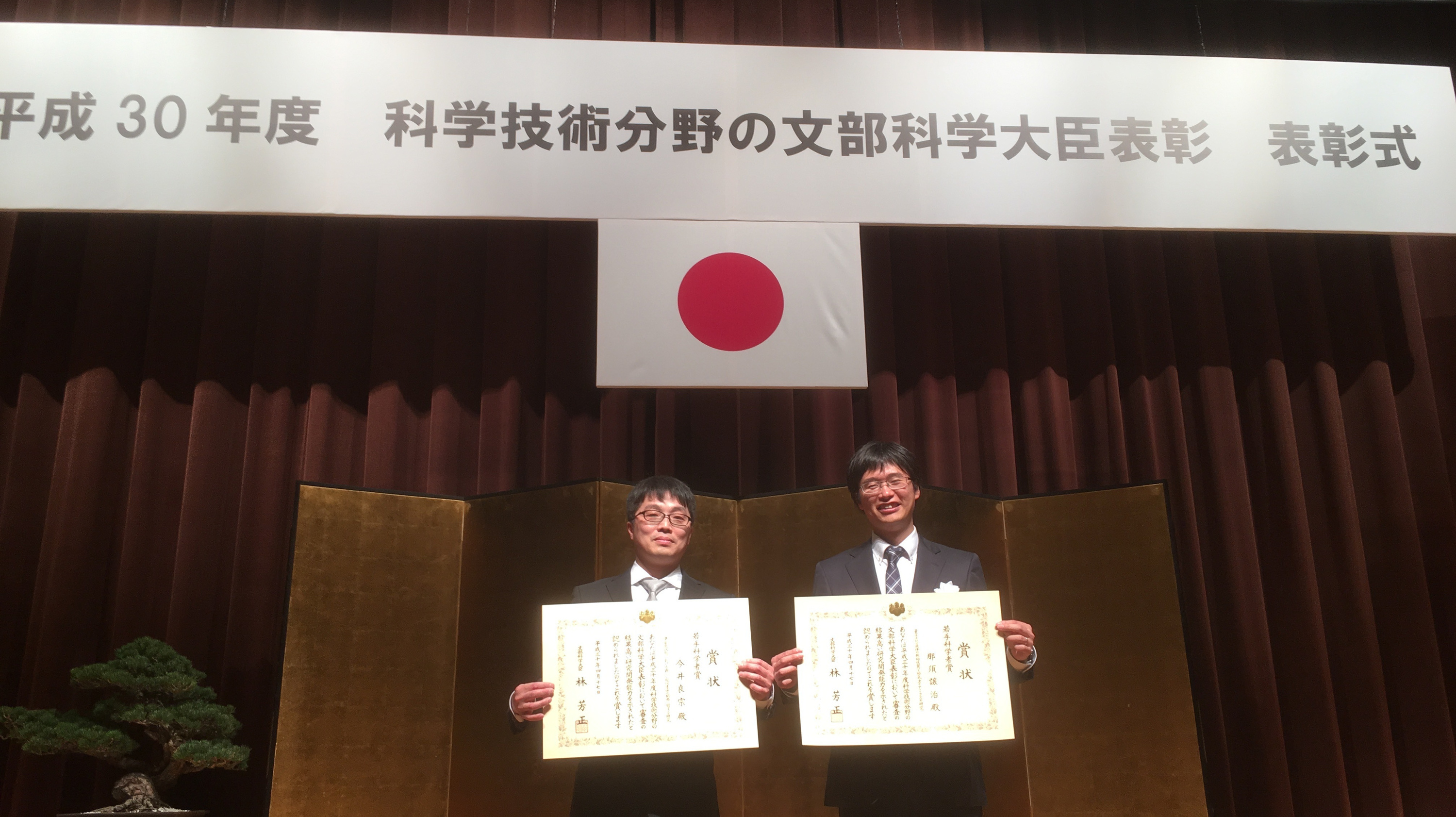 去る4月17日文部科学省で行われた平成30年度の科学技術分野の文部科学大臣表彰式において、本会会員の今井良宗氏(東北大学大学院理学研究科講師)と那須譲治氏(東京工業大学理学院助教)の2人が若手科学者賞を授与されました。若手科学者賞は、文部科学省の「科学技術分野の文部科学大臣表彰」における四つの賞のうちの一つで、萌芽的な研究、独創的視点に立った研究等、高度な研究開発能力を示す顕著な研究業績をあげた40歳未満の若手研究者に授与され、本年度は99人が受賞しています。