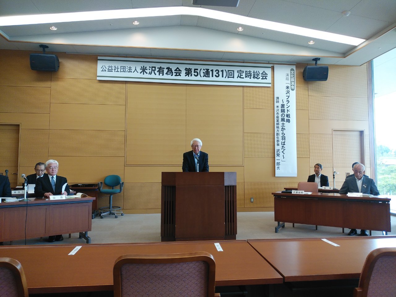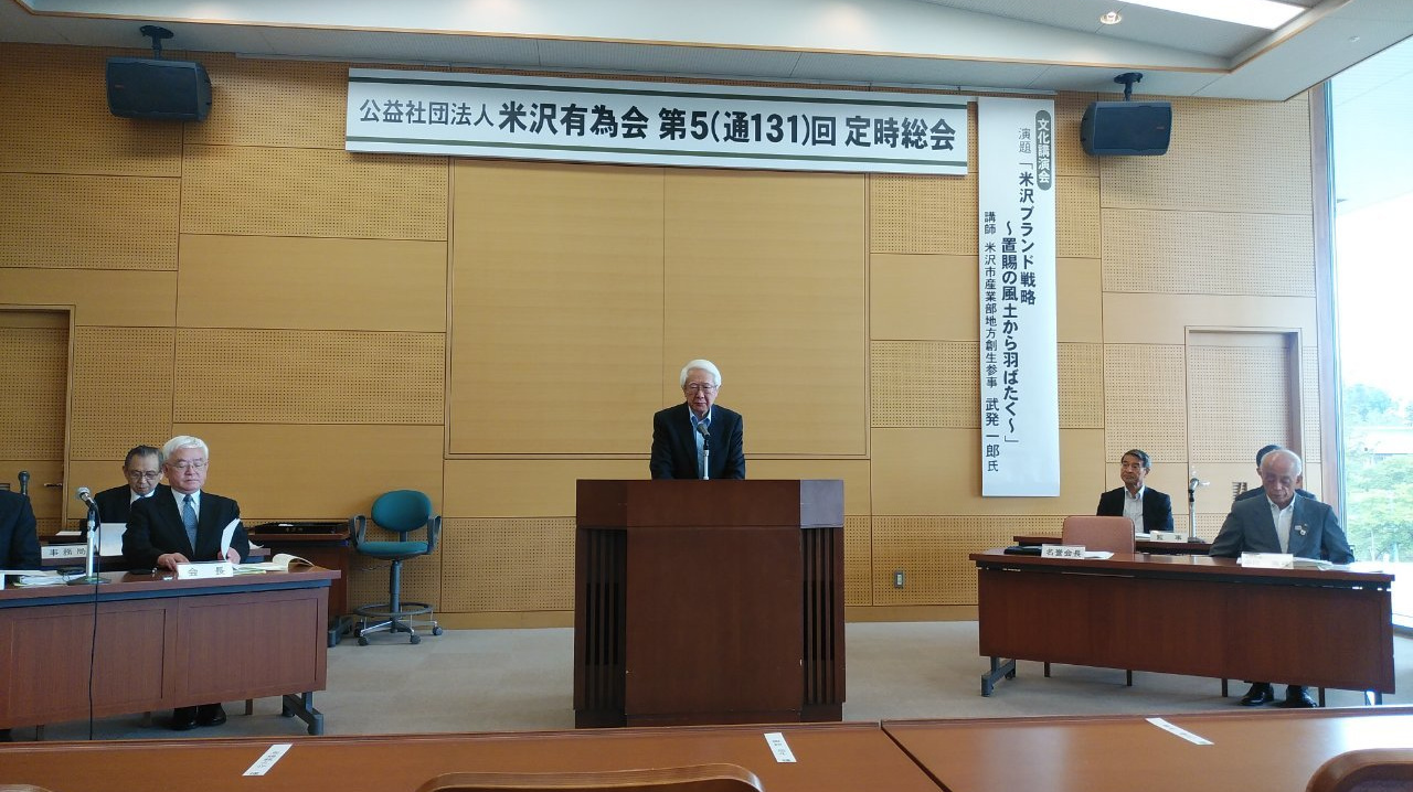 第131回定時総会は、6月23日(土)午後2時より米沢・伝国の杜 大会議室に於いて開催され、上杉邦憲名誉会長や中川勝米沢市長をはじめ約50名の会員が参加しました。総会では先ず5件の議案を全会一致で採択し、次に産業やスポーツ・文化活動で功績のあった1団体、13個人を表彰しました。また、最後に文化講演会として、講師の米沢市役所地方創生参事の武発一郎氏より「米沢ブランド戦略 ~置賜の風土から羽ばたく~」と題した講演があり、全員熱心に傾聴しました。総会終了後、上杉伯爵亭で懇親会を行い、約40名が参加し、和気あいあいと料理やお酒や会話に興じました。